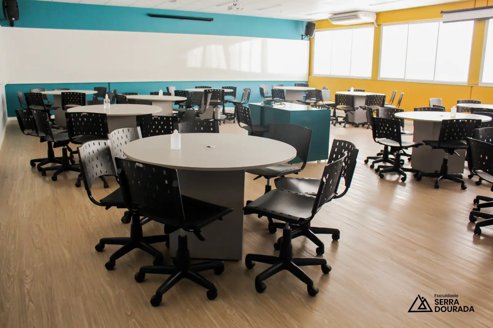 A infraestrutura do curso de Direito da Faculdade Serra Dourada inclui o NPJ com salas de audiência simuladas, +40 salas modernas, 2 bibliotecas jurídicas e espaços para debates. Ideal para prática intensiva no Vale do Paraíba.